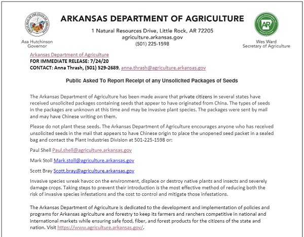 According to the Arkansas Department of Agriculture, residents of several states have reported that they received packets of seeds in the mail with writing on the outside that appears to be Chinese. While it is not known yet the precise species of the seeds, there is speculation that they could be seeds of an invasive species. If you should receive an unsolicited package of seeds in the mail, the Arkansas Department of Agriculture asks that you do not open the package or plant any unsolicited seeds.