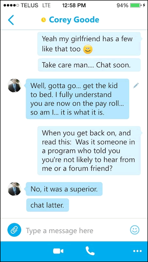 9. Ryan further claims that the same intelligence agent contact sent a screenshot of a skype conversation between the agent and yourself, wherein you said “you are now on the payroll… so am I.. it is what it is.” Since the original release of Ryan’s article, some have come forward refuting the screenshot as a forgery, saying your chat messages were altered. Did you actually send this message and is what appears the image your words? If so, how do you explain what these mean? How do you respond?