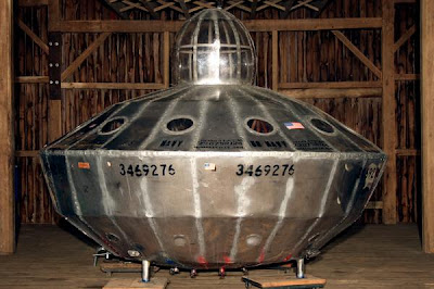 Local WWII veteran and mechanic Frank "Al" Thomas built this metallic beauty back in the 60's. Friends of Al's say that he intended to fly it, although no one ever saw him try. It was approximately 30 feet in diameter, and at least ten feet tall. There was a seat perched in the bubble for the pilot. "Exploding electricity" was the method of propulsion.