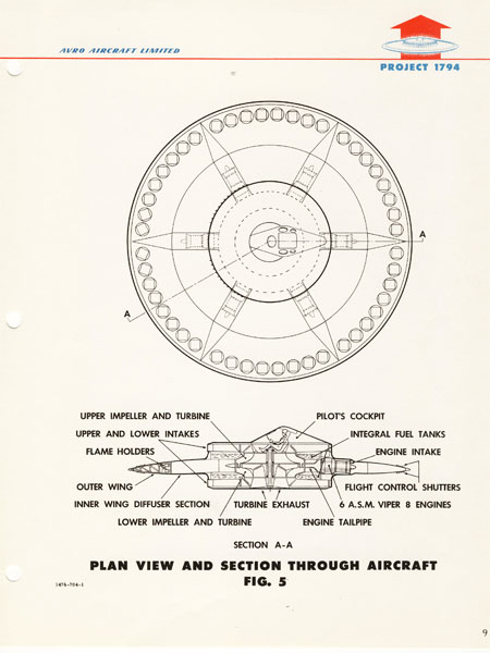 Frost's design was detailed in a 117-page report—the same document that ultimately was unearthed by the NDC. The proposed craft featured a central turbine, called a turborotor, powered by six turbojet engines. The turborotor sucked in air that was directed through the body of the aircraft. The exhaust exited from vents placed along the circumference of the aluminum saucer; vanes and shutters directed the exhaust toward the ground to hover.
