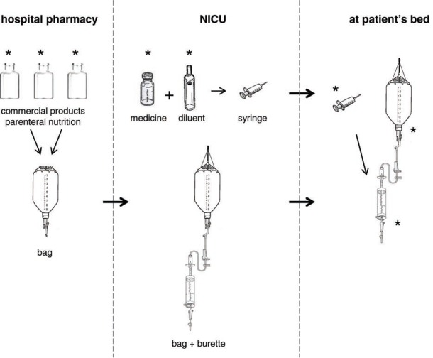 Ten premature infants fed parenterally were the subjects. The infusion bags and other apparatus that were used to feed and administer drugs were collected. To calculate urine volumes, diapers were collected and weighed before and after use. Urine samples were collected once a day.