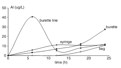 New unused infusion sets of bags, tubing, burettes, and syringes used for medications were filled with sterile water and left to soak for 24 hours. Samples were taken and examined for aluminum content. The results are shown to the left. You can see that the burette line rapidly contributes the lion’s share of aluminum to solutions, and the burette contributes a significant share after about 18 hours of use. Syringes and bags also contribute to aluminum toxicity, though not as significantly.